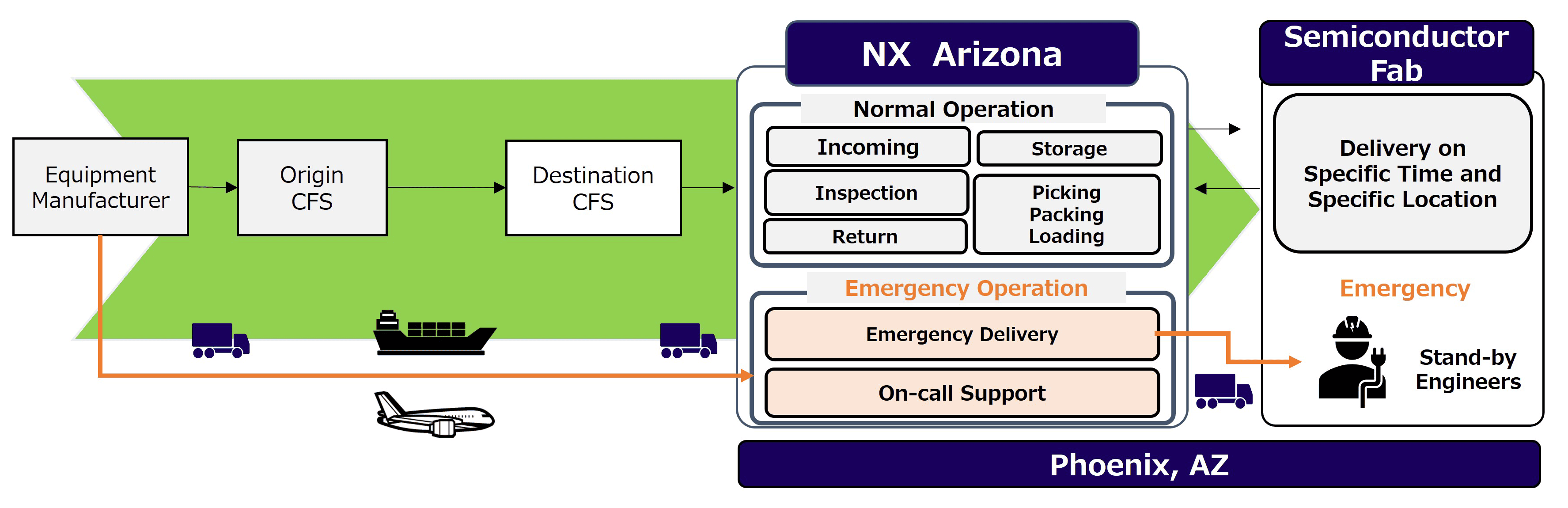 半導体サービスパーツをNXグループの物流拠点で一元的に保管・管理することで、緊急時にも迅速な出荷対応が可能に。この体制を構築したことで、半導体製造工場の必須条件である「製造ラインダウンタイムの最小化」を実現した。