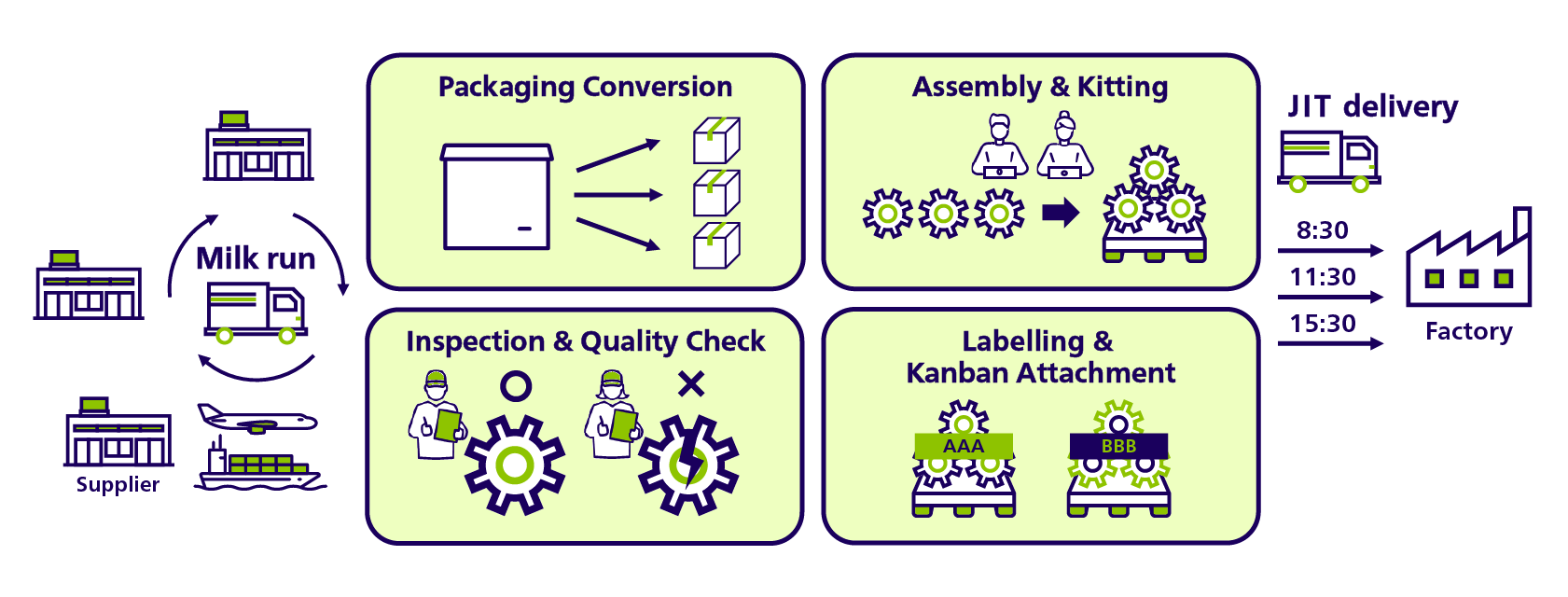 - 生産工程に適した荷姿・状態に整えたうえで、生産工場へのJIT納入を実施。