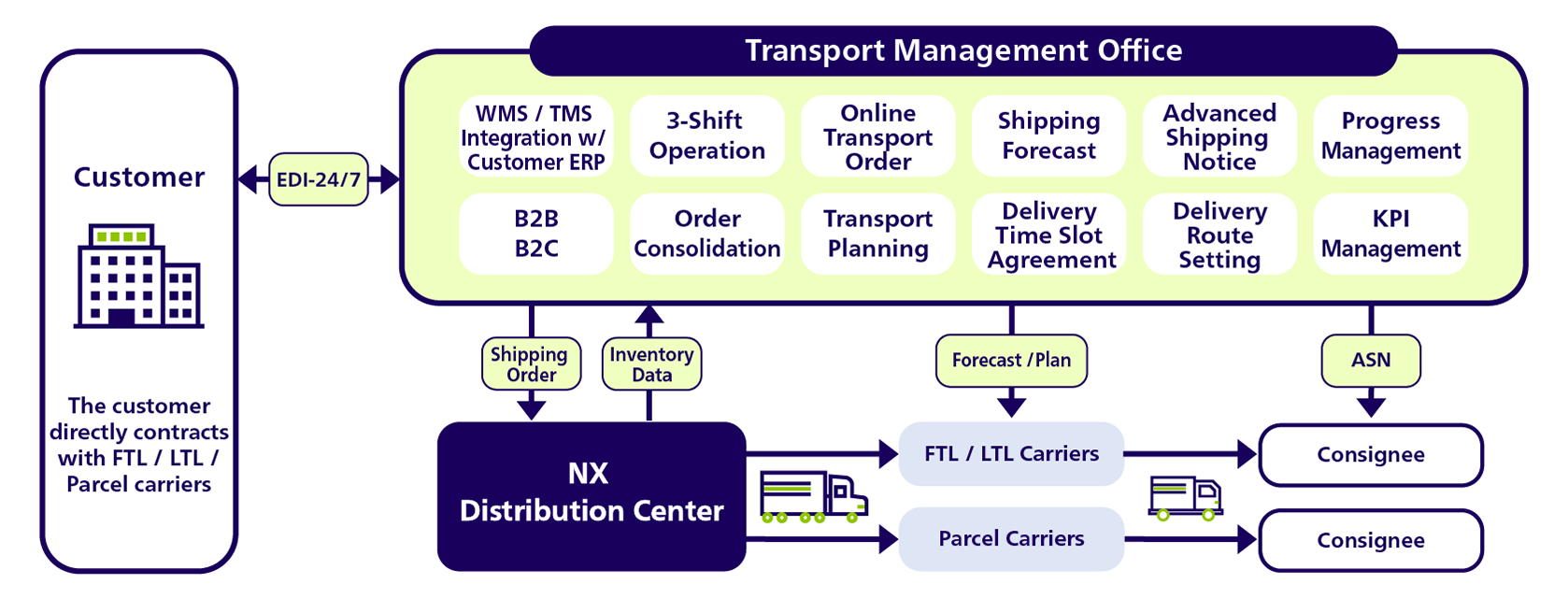 - 多国間の販売物流において、NXの物流センターを拠点に輸配送管理の中核を担い、B2B・B2C双方の出荷一元的に管理する体制を構築。