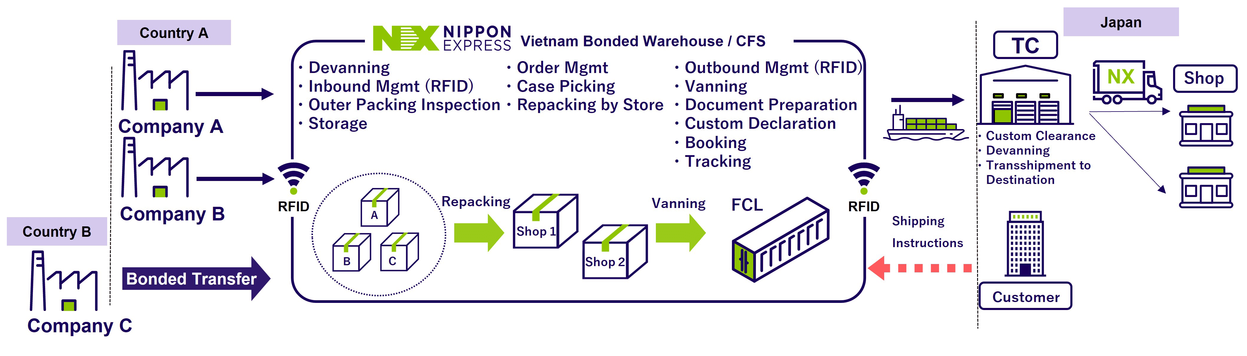 - At the bonded warehouse, NX handled a full range of operations, including devanning, inbound/outbound management using RFID, outer packaging inspection, storage, case picking, and store-specific re-packing.
